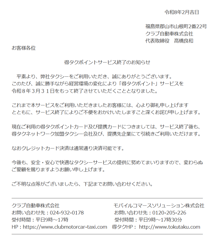 このたび、誠に勝手ながら経営環境の変化により「得タクポイント」サービスを